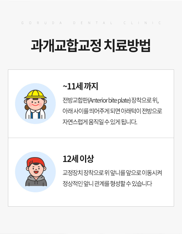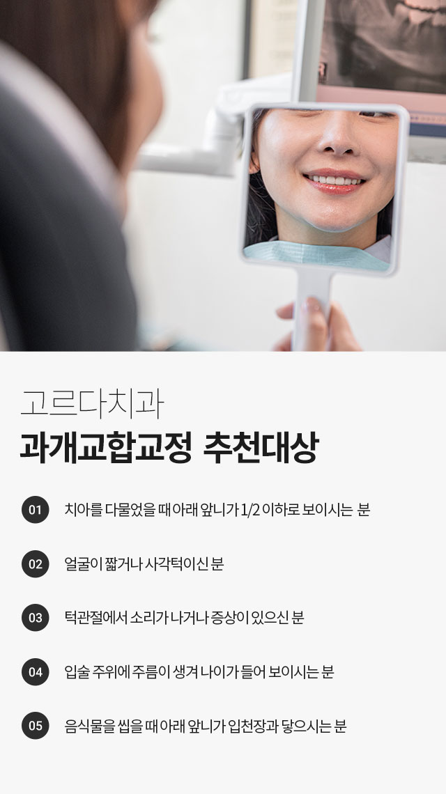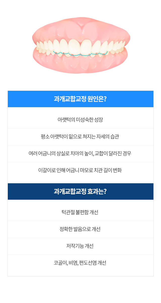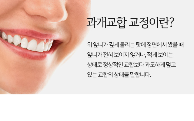 과개교합 교정 시에 위 치아들을 잇몸 속으로 끌어 올리는 것이 대표적이나 무작정 끌어 올린다면 심미적으로 좋지 않습니다. 때문에 숙련된 전문의의 높은 기술력과 체계적인 치료를 통해 교정을 하셔야 합니다.